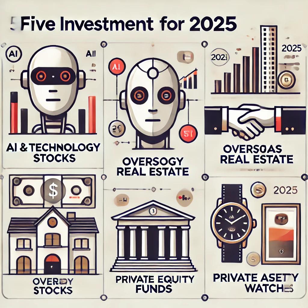오늘은 지금 사람들이 주목하는 5가지 투자 트렌드를 정리해 보겠습니다. 인공지능(AI) 및 기술주 투자, 고급 부동산 투자, 해외 채권 투자, 프라이빗 에쿼티(PE) 펀드, 럭셔리 자산 투자(예술품, 명품 시계)가 바로 그 주인공입니다.